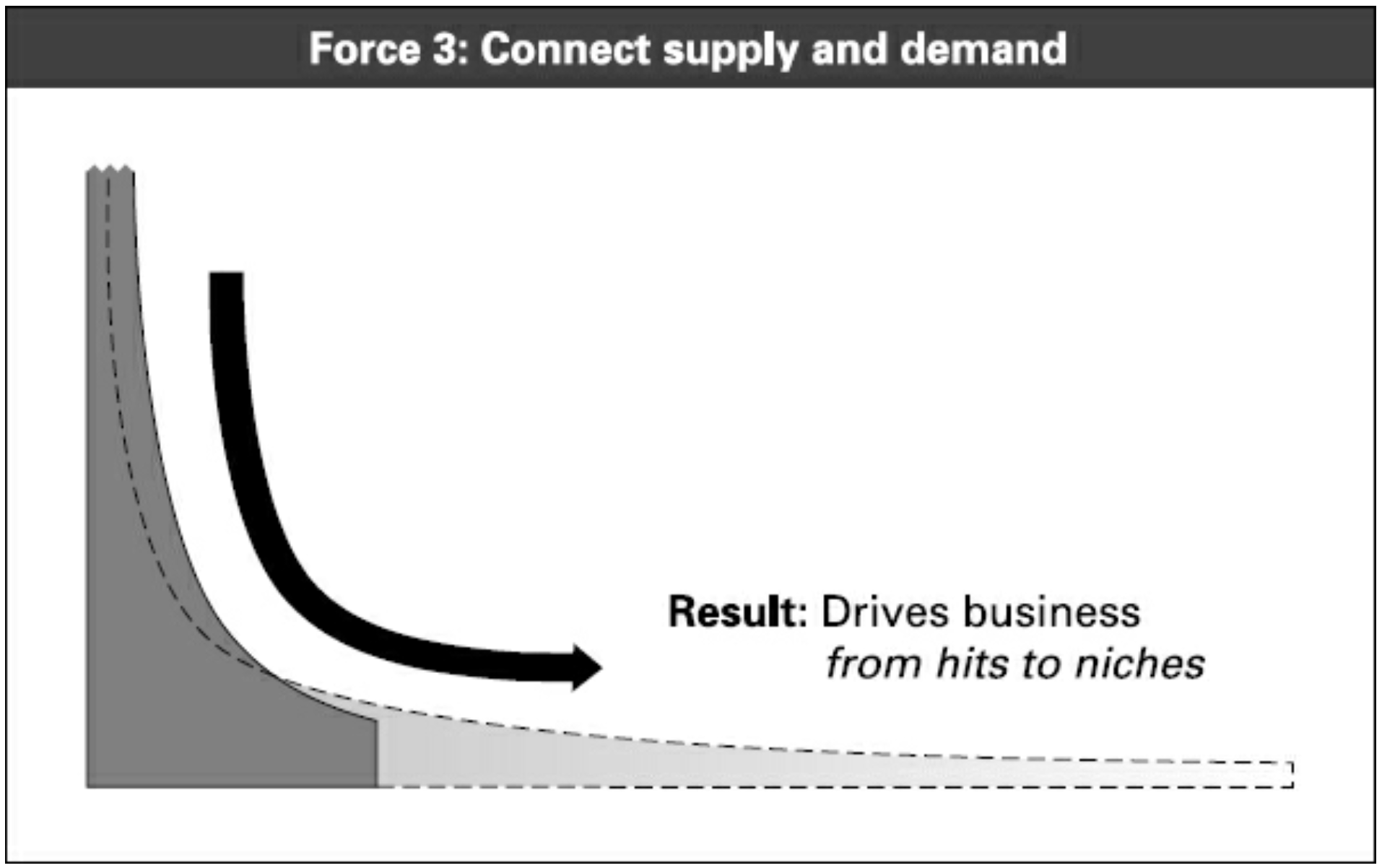 - The reduction of search costs: Software and online platforms help users find the niche content that suits their specific preferences. This, according to Anderson, happens thanks to "Google’s wisdom-of-crowds search" and "iTunes' recommendations" as well as "word-of-mouth" recommendations on "blogs" and online reviews.