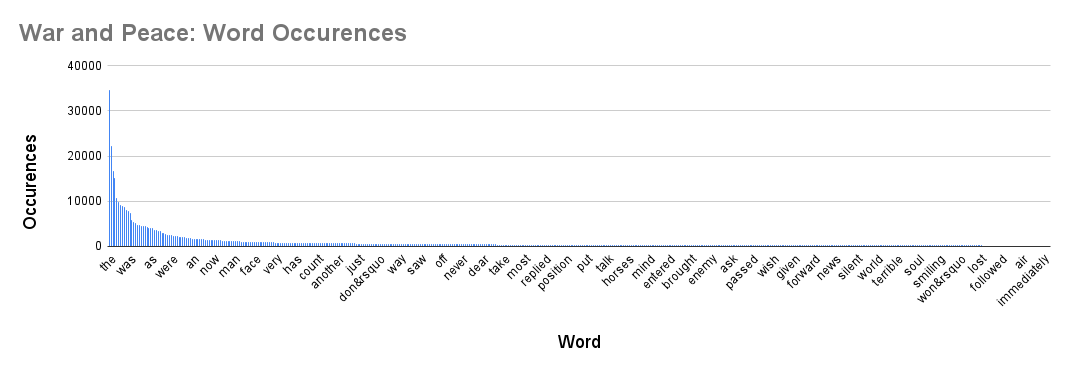 Take Tolstoy's War and Peace, for example. Below is a chart showing the occurrence of the 500 most frequent words in the book. The most common word, "the," appears 34,738 times. The second most common word, "and," appears 22,297 times or close to half the times as the first. The 14th most common word, "had," appears less than 1/10 of the times as "the." And so on. The frequency of words diminishes in a relatively ordered fashion.