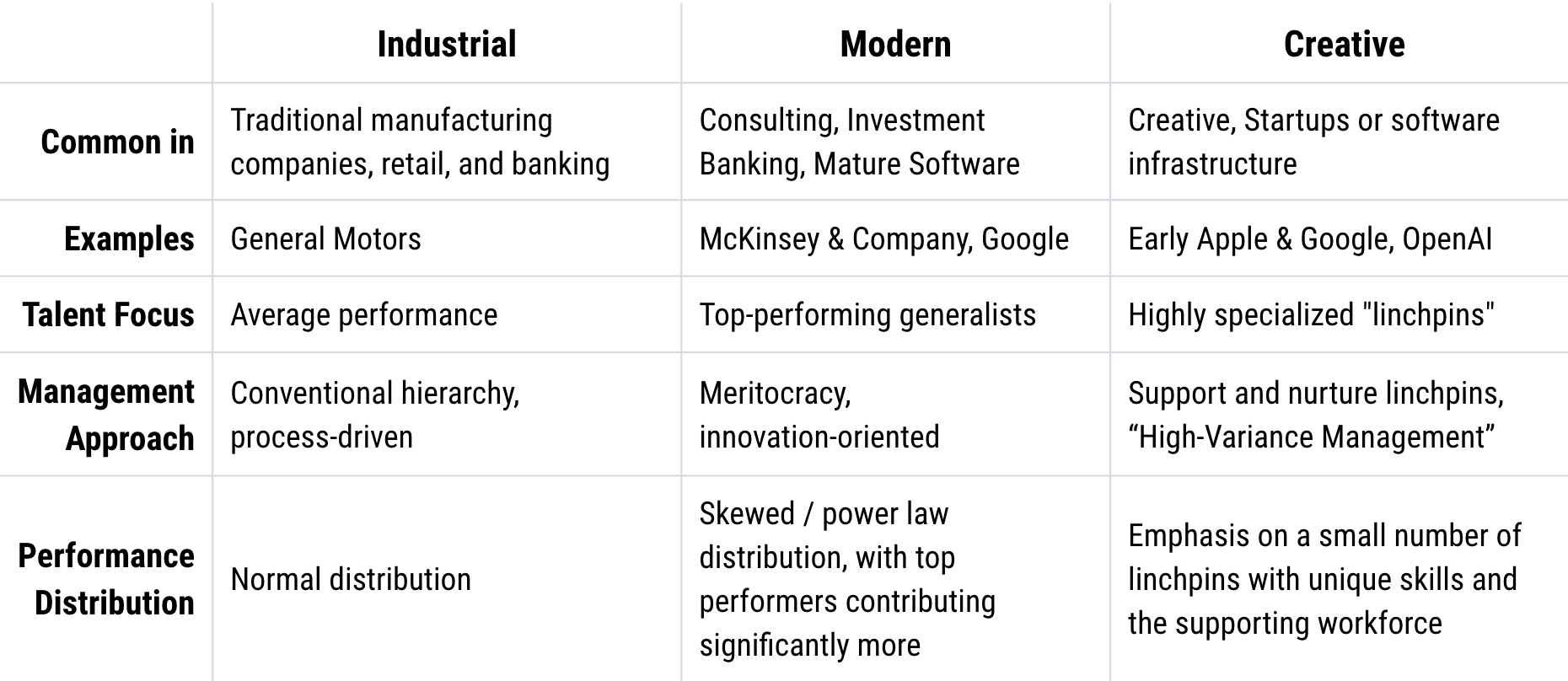 The gist of the theory is that "Corporate culture norms can be explained by the types of talent that a company is trying to acquire or cultivate." Companies tend to fit into one of three types based on the distribution of talent within them. Nadia uses different terms to describe these company types, but I call them Industrial, Modern, and Creative.