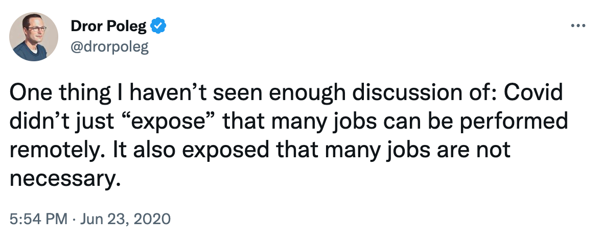 Remote work doesn't just move some jobs out of the office — it also makes it clear that many office jobs are not necessary. This trend was hard to notice amidst the general Covid turmoil. But it is becoming easier to see now.